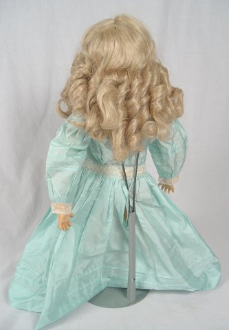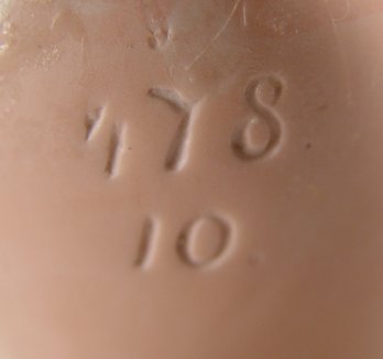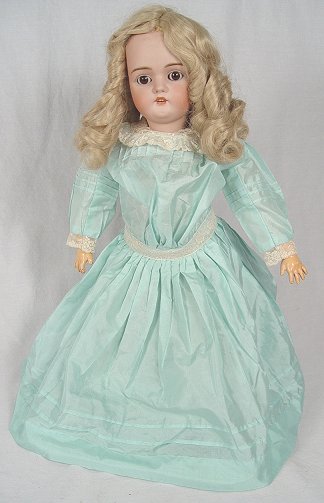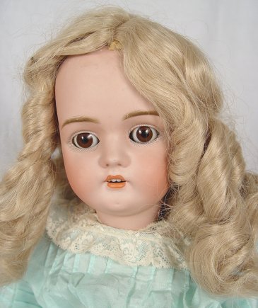PORCELAIN HEAD DOLL: Early 20th C doll with blonde curly wig, open brown glass eyes, open mouth with teeth, pierced ears, Fully jointed body. 22'' tall. Back of head impressed ?78 / 10.