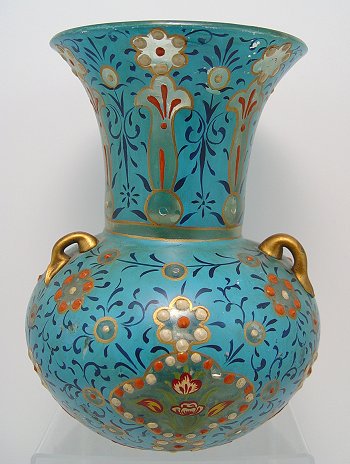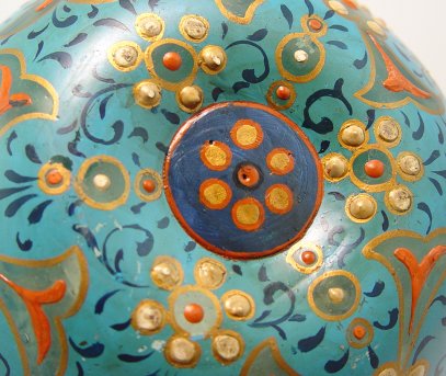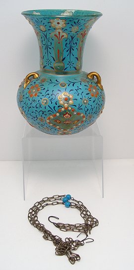 ANTIQUE PERSIAN IRANIAN BLOWN GLASS HANGING LIGHT: For a candle- deep turquoise colored glass with heavy enamel decoration. 9''h, 5 3/4'' dia. at the rim.