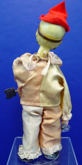 TIN WIND UP MUSICIAN CLOWN TOY: Head nods from side to side, one arm beats the drum. Working condition. Approx. 9''h.