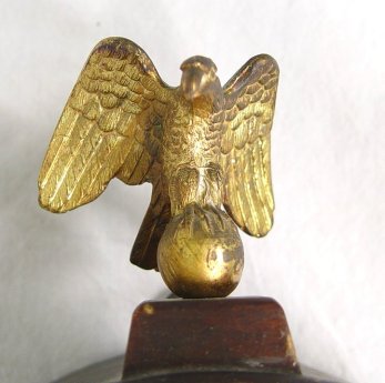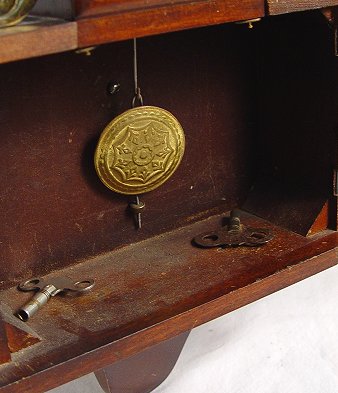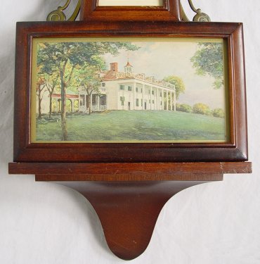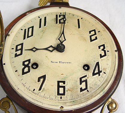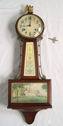 NEW HAVEN MAHOGANY CASE BANJO CLOCK: 8 day, 1/2 hr. strike. Eagle finial on a mahogany case, scenic tablet. Dial and paper by New Have Clock Co. 29''h, x 9 1/2''. Key and pendulum.