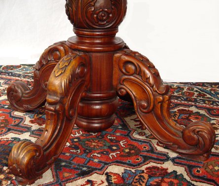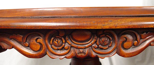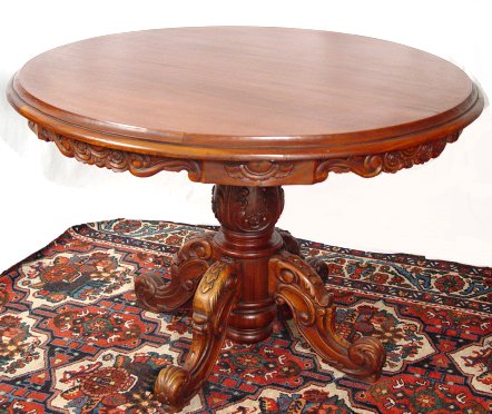 IMPORTED CARVED MAHOGANY ROUND CENTER TABLE: Single pedestal round table, 33''h, 47'' dia. including the tiered beveled edge.