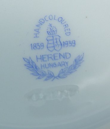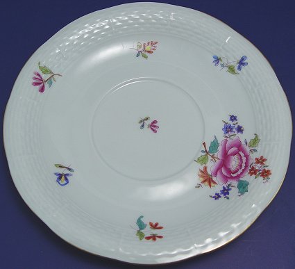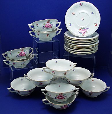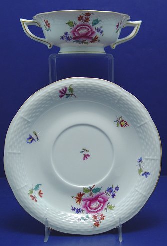 SET OF 8 HEREND FINE CHINA CREAM SOUP BOWLS AND SAUCERS: Hand colored floral design on classic Herend basket weave molds. Plates are 7'' dia., double handled bowls are 5 1/4'' dia. There are 4 extra saucers.