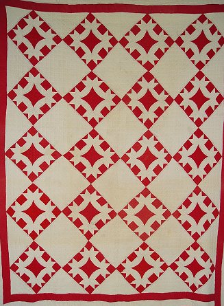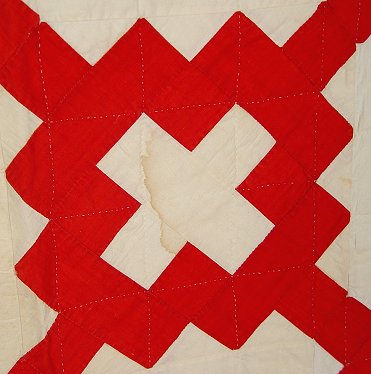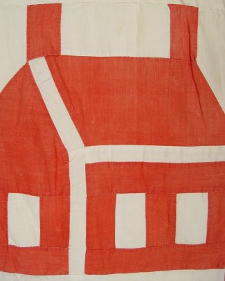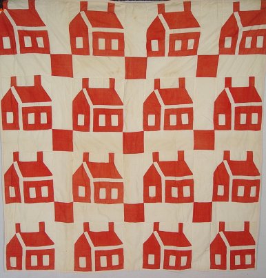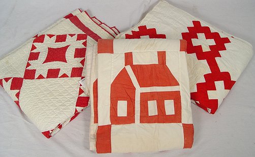 3 RED AND WHITE HAND SEWN QUILTS: School House applique quilt, 61'' x 63''. Sold with two red and white geometric patchwork quilts, approx. 82'' x 60'' and 84'' x 67''. No holes or tears. Minor discoloration from age.