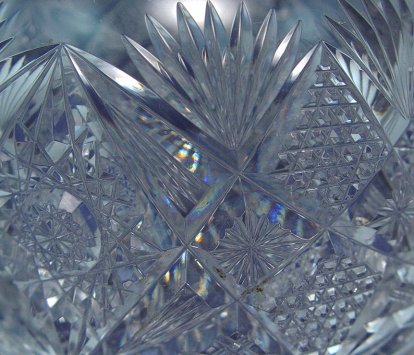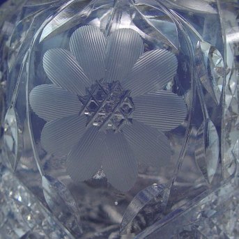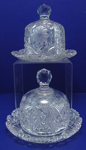 TWO BRILLIANT CUT GLASS BUTTER DISHES: Each with a faceted finial. One cut in a floral design, the other in strawberry, fan and star cut. Underplates are 7 3/4'' dia.