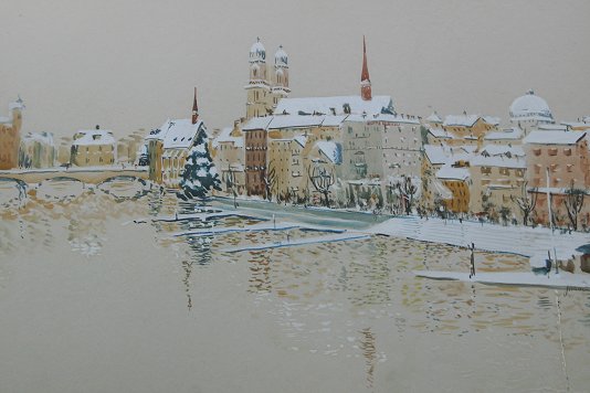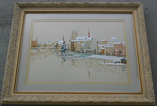 EARLY 20TH CENTURY EUROPEAN CITY SNOW SCENE: Signed lower right, J.Mueller?, W/C, 16 1/4'' x 22 3/4'', encased in antique painted and embossed white molding, 27'' x 33 1/4''.