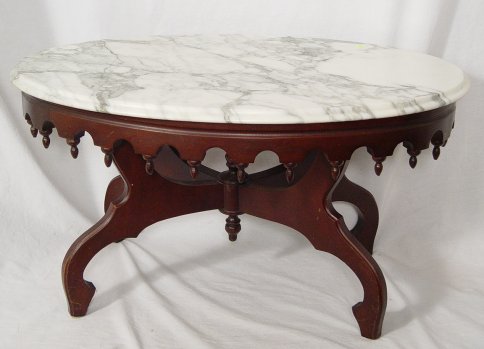 VICTORIAN TEA TABLE WITH MARBLE OVAL TOP: Mahogany base and skirt decorated with finials, 21 1/2'' x 33''. Est. $300/400**