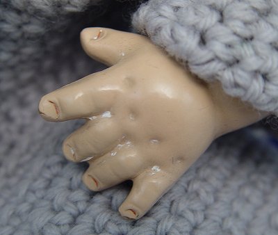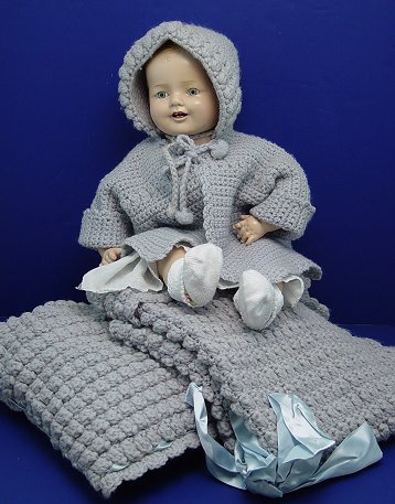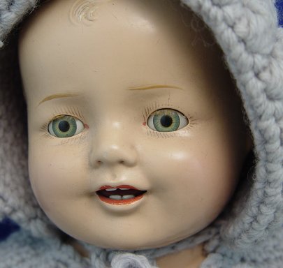 1930's COMPOSITION BABY DOLL: Blue litho eyes open and close. Molded hair. Soft cloth body, 19'' long. Small crack on side of head, under the bonnet.