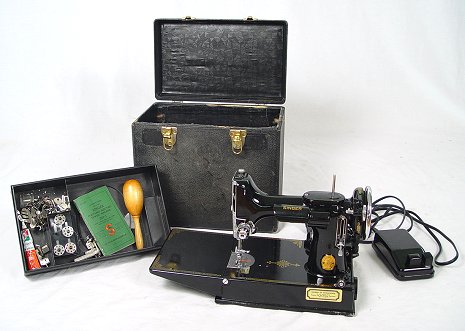 SINGER FEATHERWEIGHT SEWING MACHINE: In the case with accessories and booklet for 221-1. The case is 11 1/2'' x 13'' x 8''.