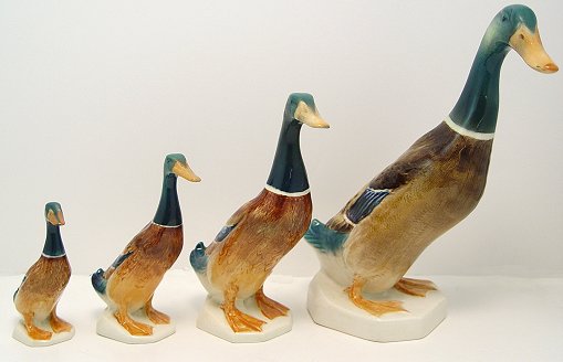 SET OF FOUR BESWICK MALLARD DUCKS: Including the 9.5'' large #902. Also in this lot is the #756-1, #756-2, and 756-2F. The smallest is 4 1/2'', the tallest 9 1/2''. Please note 756-2 has a repaired beak.