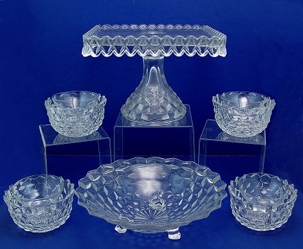 GROUP OF FOSTORIA AMERICAN: To include 10'' square cake stand on pedestal, set of 4 shrimp cocktail bowls wit inserts, 5'' dia. and a 10 1/2'' dia. footed bowl.