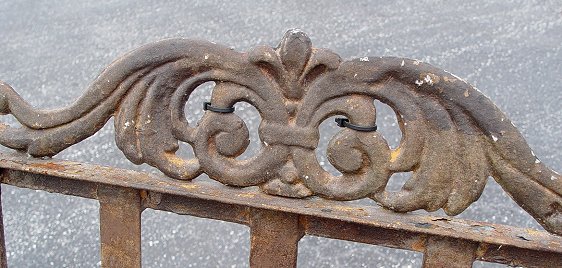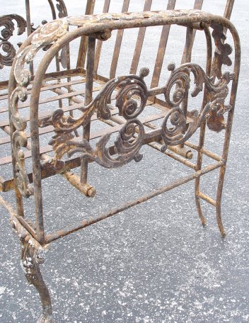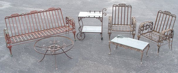 IRON PATIO FURNITURE attri. TO WOODARD: Glass top, two tier tea cart, sofa, a pair of arm chairs, and a glass top coffee table. Sold with a round coffee table. Cushions will need to be replaced.