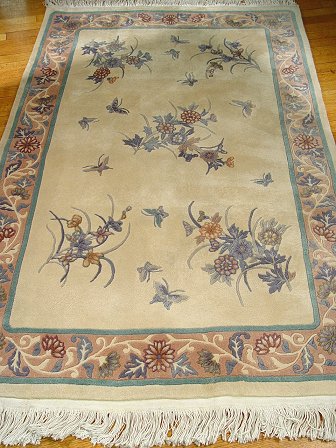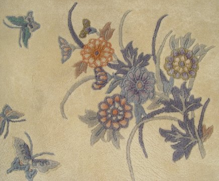 BUTTERFLY DECORATED CHINESE SCULPTED CARPET: Approx. 6' x 3'10''. Pink, lavender, greens and blue on creamy ground. Floral and butterfly motif.