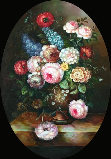 CONTEMPORARY OLD MASTER STYLE OVAL FLORAL STILL LIFE: O/C, sight size measures, 35'' x 23'', embossed gold frame is in overall condition with minor wear to finish.