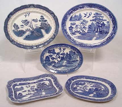 5 BLUE WILLOW PLATTERS: Spode ''Ye Olde Willow'', 12/5'' x 9.5''. Booths ''Real Olde Willow'', 15 3/4''. Bisto England large oval platter, 16 1/4''. An English platter, 12 1/2''l, and a Japanese Blue Willow platter, 12'' oval. No chips or cracks.