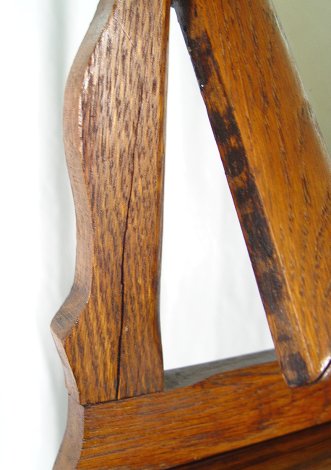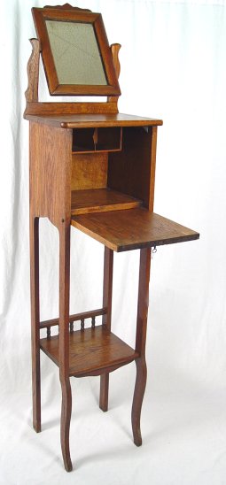 RARE GOLDEN OAK FLOOR STANDING SHAVING STAND: Mirror swings between supports (one has a separation), fall front storage, lower shelf.