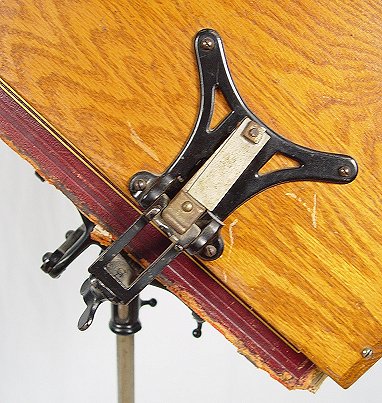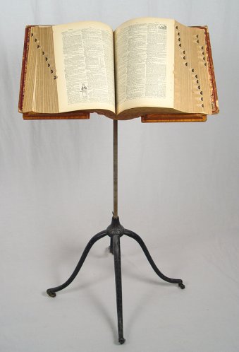 VICTORIAN ERA IRON AND OAK FLOOR STANDING BOOK STAND: Adjustable height, iron scrolled legs on castors, oak book support.