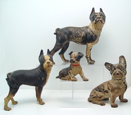 GROUP OF 4 VINTAGE CAST IRON DOORSTOPS: Hubley French Bulldog, 8''h. Two Boston Terriers, one is 10'', the other is 7 1/2''h. And last but not least is the terrier puppy, 4 1/2''h. All original paint with some loss and some rust. Sold as a lot.