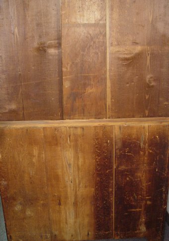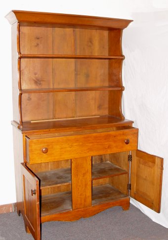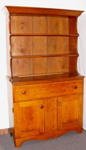 EARLY PINE STEPBACK CUPBOARD: Open cupboard with two shelves, plate grooves recessed over a full length deep single drawer over two door base. Straight molded cornice, shaped base between bracket feet. 74 1/2''h. x 43 1/4''w. x 17''d.