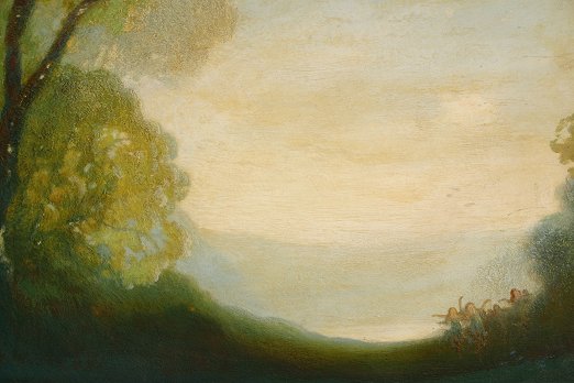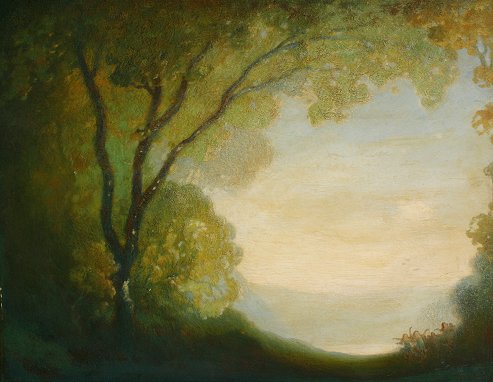 EARLY 20TH CENTURY FANTASY LANDSCAPE WITH FROLICKING MAIDENS IN THE STYLE OF A.B. DAVIES: O/Thick Wood Panel, 28'' x 36'', no visible signature, encased in a gold frame. Condition - Some abrasions, needs cleaning, good overall.