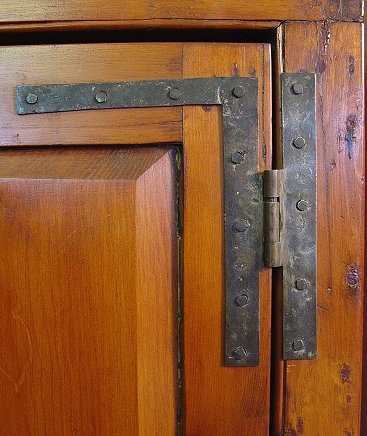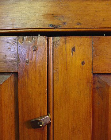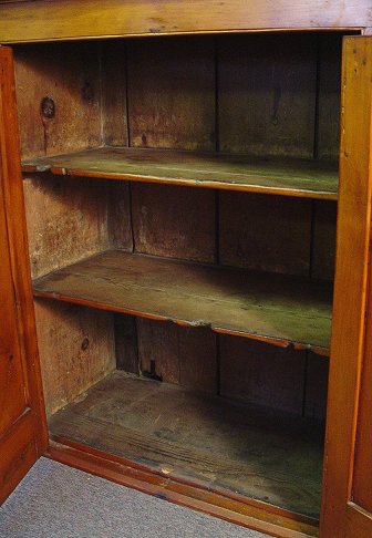 EARLY PINE TWO DOOR CUPBOARD: Double door cabinet, straight overhanging cornice. Shelved interior. 46''h. x 40 1/2''w. x 18 3/4''d.