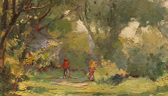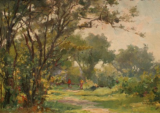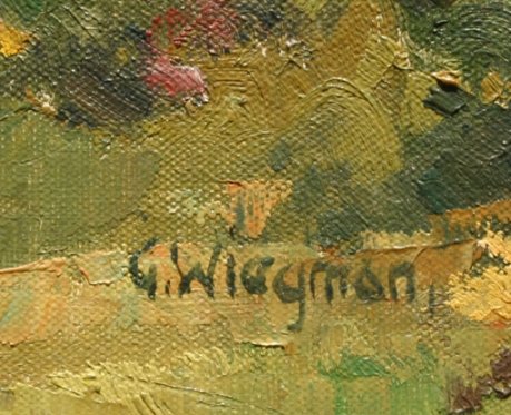 WIEGMAN, Gerard, (Dutch, 1875-1964): Country landscape with figure traveling along a path, O/C, 16'' x 22'', signed lower right, enclosed in original gilded molding with fabric mat, some wear to the patina, 20'' x 26''. Condition - Needs cleaning.