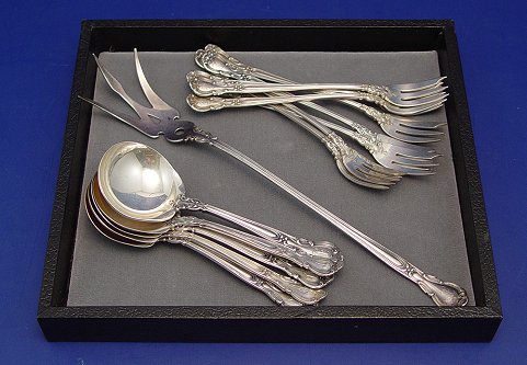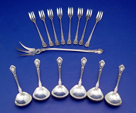 15 PCS GORHAM ''CHANTILLY'' FLATWARE: Assorted pieces to include, Lettuce Serving Fork, 9 1/4''l., 6 bouillon spoons, 4 7/8''l. and eight cocktail forks, 5 1/2''l., all monogrammed W, ''Lion/Anchor/G Sterling'' mark.