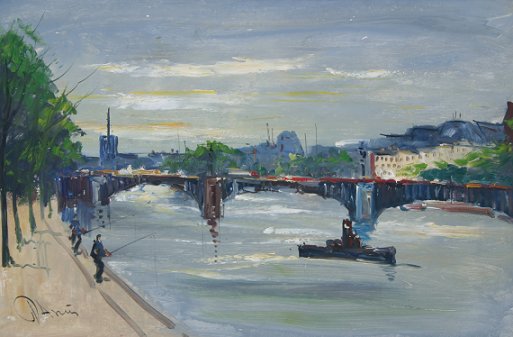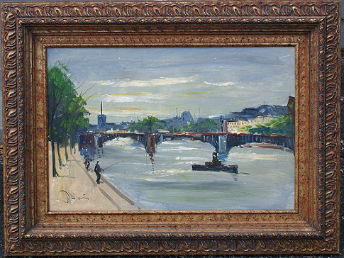 IMPRESSIONIST VIEW OF THE RIVER SEINE: O/C, Circa 1950's, 24'' x 36'', illegibly signed lower left, encased in a heavy gilded, embossed molding. Condition - Several visible scrapes with some minor paint fleck. Est. $300/500**