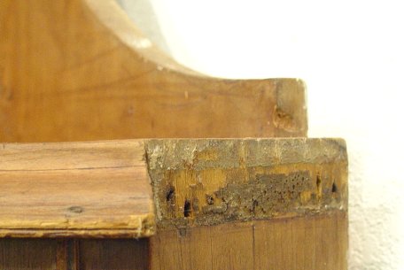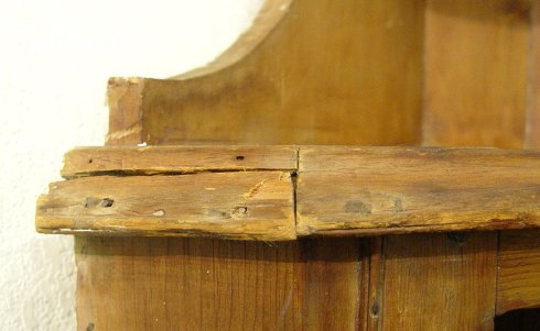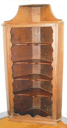 LATE 17TH EARLY 18TH C HANGING PINE OPEN CORNER CUPBOARD: Sculpted framed opening with a 4 shaped shelf interior, recessed open storage under the shelves. Molded cornice across the front only, rose head nails to back, 71 1/2''h. x 36''w.