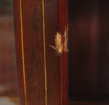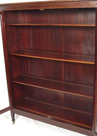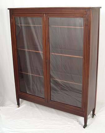 MAHOGANY STRING INLAY CHINA CABINET BOOKCASE CA 1900: 53 1/2''h. x 12 1/2''d x 42''w. Double glass doors, 4 grooved wood shelf interior. Est. $450/650**