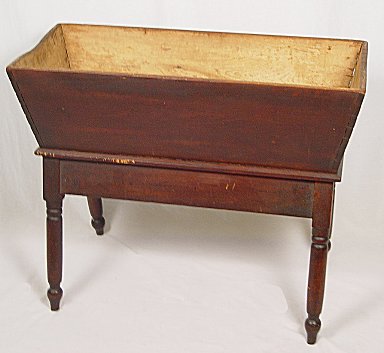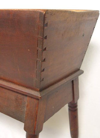 19TH C PINE DOUGH BOX WORK TABLE: Two board flat top work surface completely lifts off to expose the dough box. Splayed and turned legs. Dovetail and square nail construction. 28''h, x 41'' x 20 1/2''.