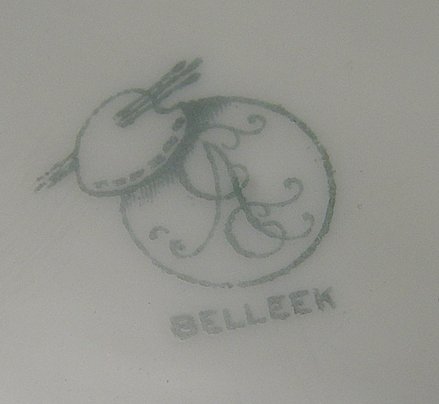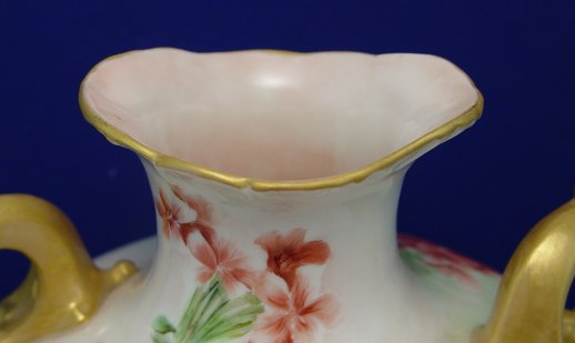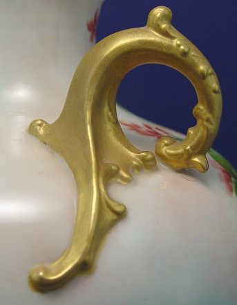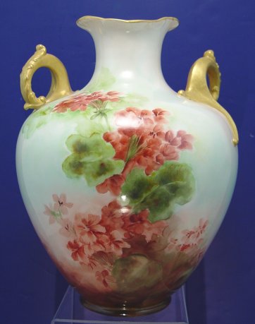 CERAMIC ART CO. BELLEEK HAND PAINTED VASE: Ca. 1894-1906. Hand painted, finely detailed floral decoration. Double gilt scrolled handles. Artist pallet CA Belleek mark. 11 1/2''h. 9'' dia. at the widest. No chips or cracks.