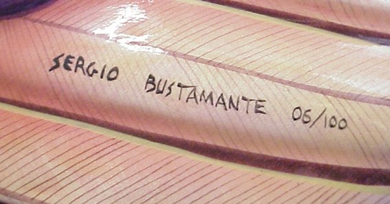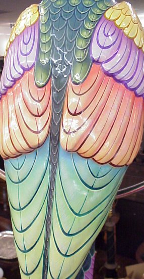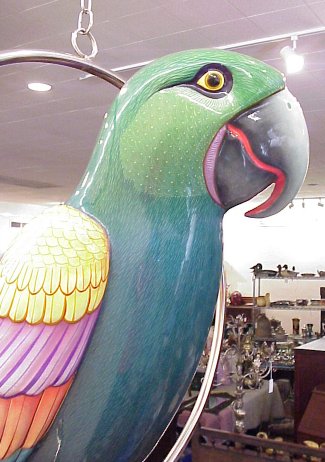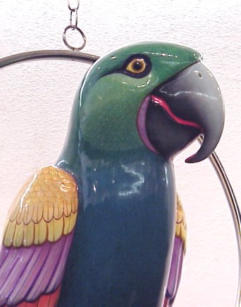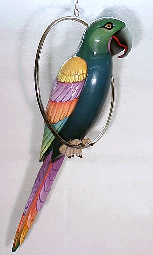 BUSTAMANTE, Sergio, (Amer., 1942-): Colorful macaw on custom round swing, Acrylic on Paper Mache, #6/100, signed on wing, 58''l.