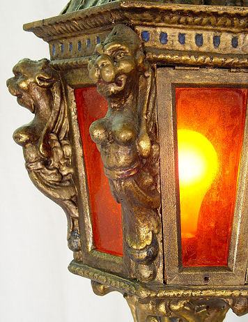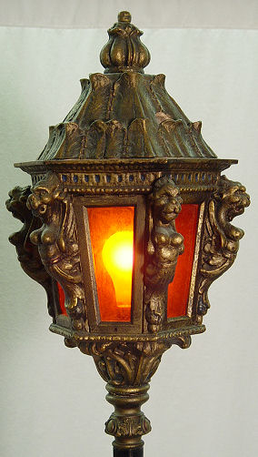 1920's LION HEAD FLOOR TORCHIERE: Design motifs feature four lion heads around the shade, cupids at the base. Original polychrome and gilt finish, velvet covered pole. 71''h.