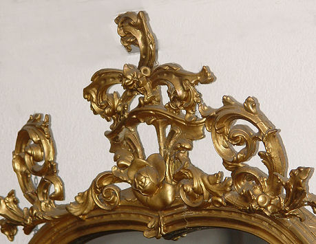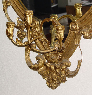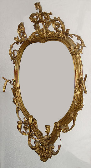 LARGE 19TH C FRENCH GILDED MIRROR AND CANDLE SCONCE: Shield shaped gold gilt frame with foliate & cat tail decoration, scrolling arms to the three candle holders on front, overall approx. 59'' x 41'', 9''deep.