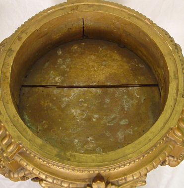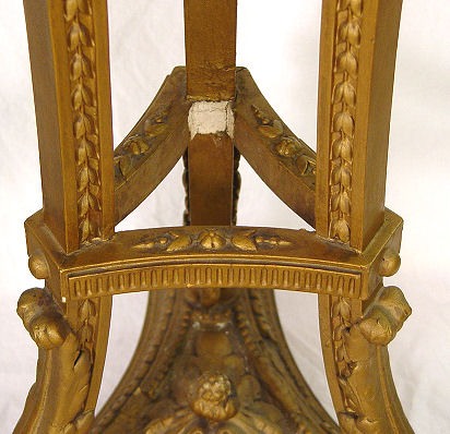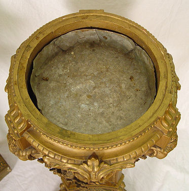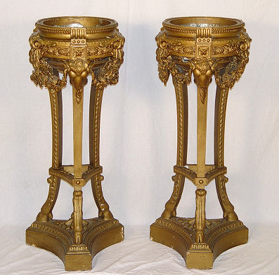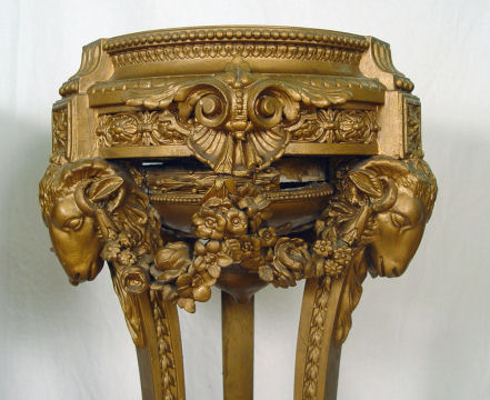PAIR OF GILT WOOD RAMS HEAD FERN STANDS: Gesso and painted wood. Rams head and rose swag decor, tin inserts. 39''h. 13'' dia. Please call for condition.