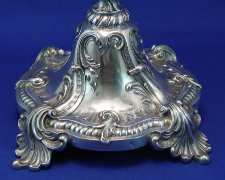 GERMAN FINE 800 SILVER SIX LIGHT CANDELABRA: Ornate scrolled leaf arms support the six lights, removable bobeches (one has a tilt), Marked with the crescent, crown and 800 mark. 23''h. Approx. 54.70 oz. total.