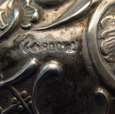ORNATE PAIR OF GERMAN FINE 800 SILVER CANDLESTICKS: Repousse floral, foliate and scroll design, scrolled feet. Struck with the crescent, crown 800 mark. 12''h. Approx. 28.5 oz. total.