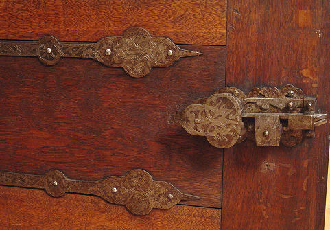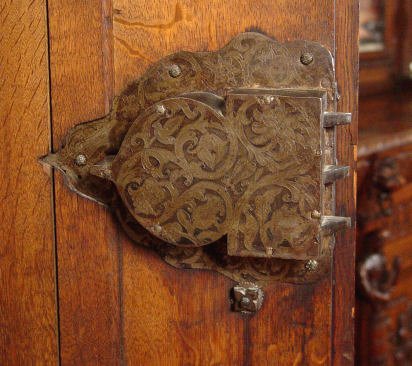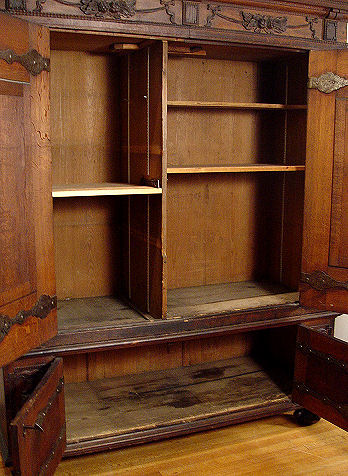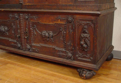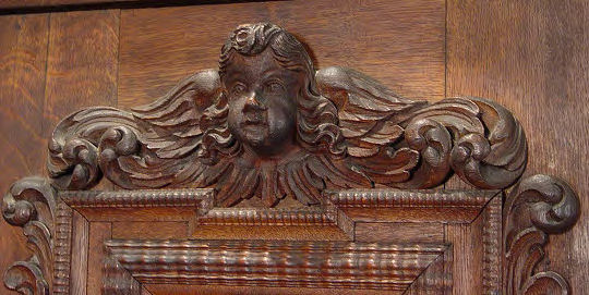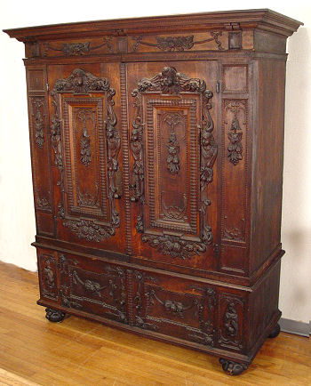 EARLY HEAVILY CARVED DUTCH KAS: Large two door cupboard or press. Each of the doors has a panel crested with winged angel heads and framed in masqueron heads and fruit. Shelved interior. 63 ½''h x 66 ¼'' x 30'' Est. $6000/7000**