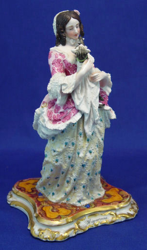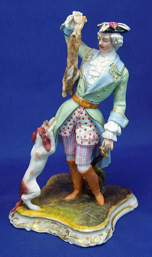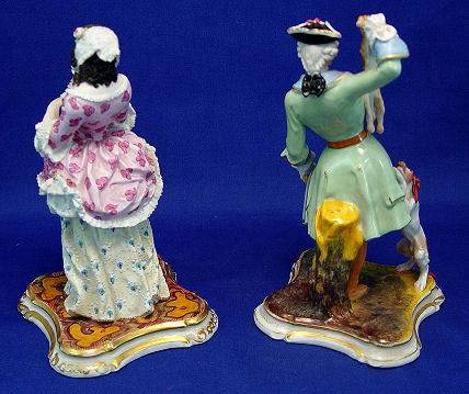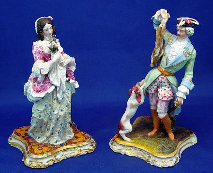 FRENCH PORCELAIN OLD PARIS FIGURINES CA. 1850: Man with rabbit and hound. The companion piece is labeled ''Mignonne'' (Darling), woman with her precious cat. Approx. 9''h.