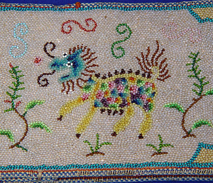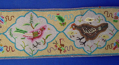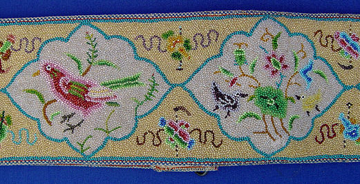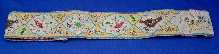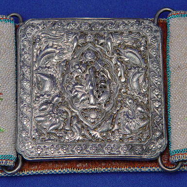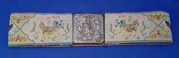 CHINESE BEADED BELT WITH SILVER BUCKLE: Intricately beaded belt and carved silver buckle. Belt with overall beading, decorated in shaped panels of dragons, wrens and hens with chicks, backed in leather with two hidden pockets, beaded belt 3 1/4''w. x 30 1/2''l. Wonderful buckle centered by a deity with crane, deer? and flowers, surrounded by phoenix, dragons and fish all bordered by a band of flowers. Measures 3 1/4'' x 3'', double hook back with multiple character marks. Overall 34''l.