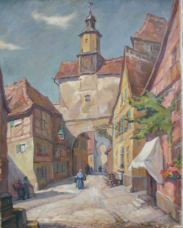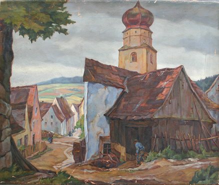 OERTLE, Hans, (European, 20th C): Pair of village scenes with figures, O/Cs, 22 1/4'' x 27'', unframed, signed lower right, dated '33. Second piece is 20'' x 15 1/2'', unframed, signed lower right H.Oertle, dated 1934. Condition - First piece has surface abrasions and several areas of in-paint. Second piece has several areas of paint fleck, several pin holes. Sold as is.
