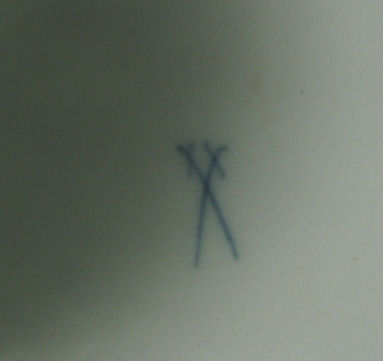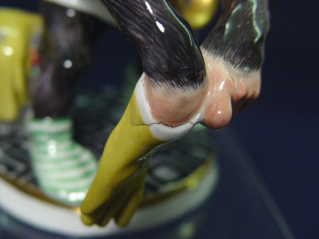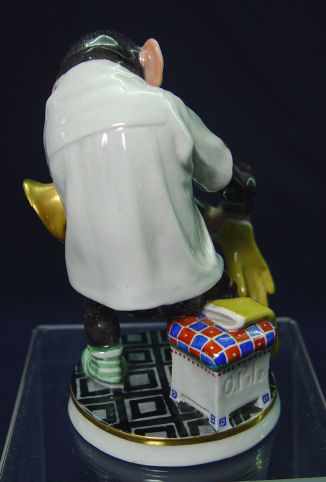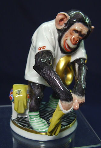 MEISSEN CHIMPANZEE FRENCH HORN PLAYER: Humanistic character putting on his gloves with the horn in tow. Modeled by Otto Pilz. Blue cross swords mark under glaze. 5 7/8''h. No chips or cracks, there is a factory near the glove.