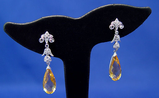 BRIOLETTE CUT CITRINE & DIAMOND EARRINGS: Large citrines of approx. 8.26ct total in sparking briolette cuts dangling from diamond encrusted three tier post back earrings, approx. 1 1/2''l each, 14k white gold, 4.2 grams total. Matching pendant to follow. Est. $400/600**