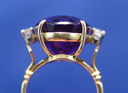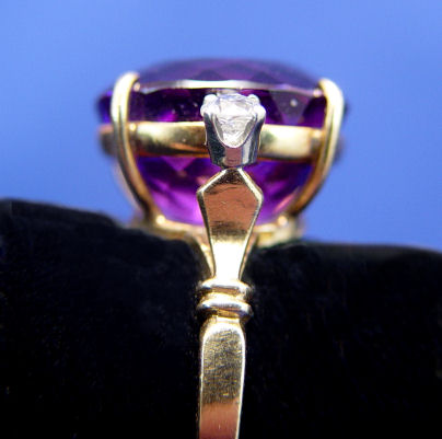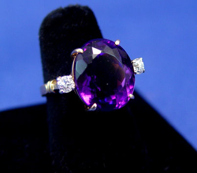 VIBRANT SIBERIAN AMETHYST & DIAMOND RING: Approx. 7ct oval amethyst prong set with two small period diamonds, 14k yellow gold, size 5.75, 5.5 grams. Est. $400/500**
