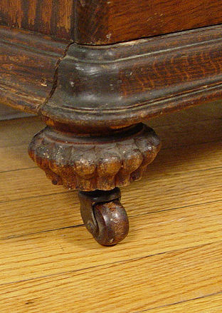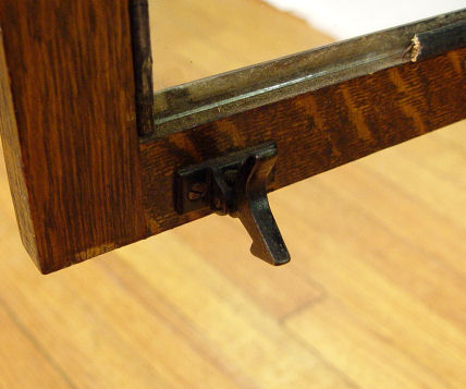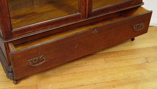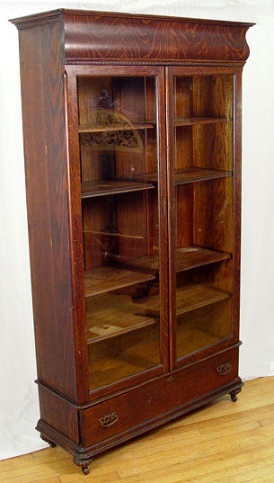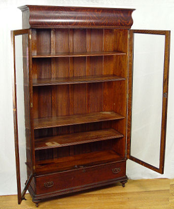 EARLY 20TH C TIGER OAK TWO DOOR BOOKCASE: Forest City Furniture, Rockford, Illinois. Double glass front doors, single drawer at the base. Adjustable shelves, 70''h x 42'' x 15''.