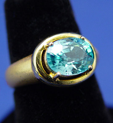 LADY'S 22K GOLD AND ZIRCON RING: Oval cut blue zircon set in contemporary mount of brushed and polished 22k yellow gold, 6.3 grams, size 7. Est. $500/700**