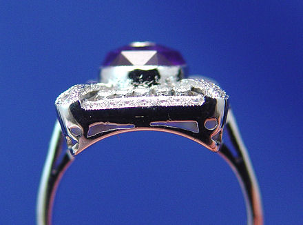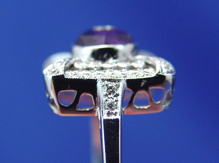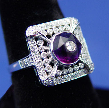 LOVELY AMETHYST & DIAMOND RING: Diamond encrusted square top centered by a faceted deep purple amethyst inset with another diamond, all mounted in 18k white gold. Approx. 1.66ct amethyst and very approx. 30pts total of diamonds, approx. 4.5 grams, size 7. Est. $500/600**