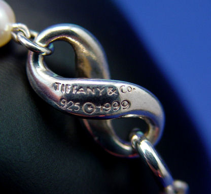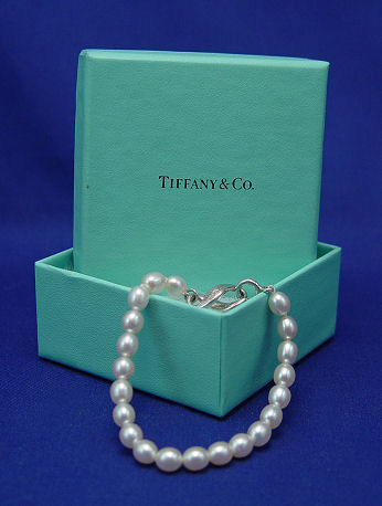 TIFFANY & CO. ''EIGHT'' STERLING & FRESH WATER PEARL BRACELET: Authentic Tiffany bracelet, approx. 6.3mm slightly oblong fresh water pearls, sterling ''8'' clasp signed Tiffany & Co. 925/1999, retails approx. $295.00. Sold with original Tiffany & Co blue box. Est. $200/300**