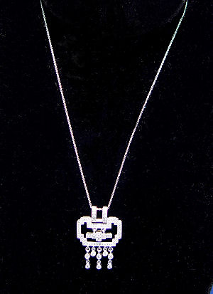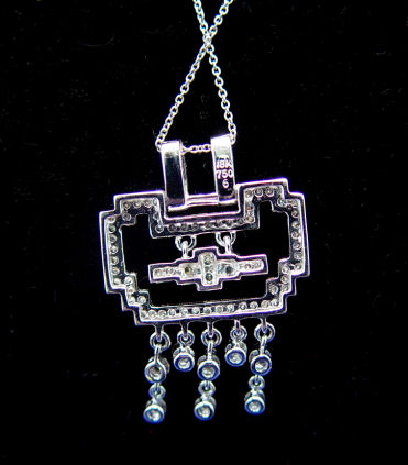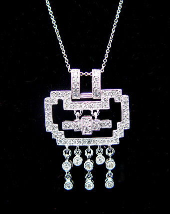 DIAMOND DECO REVIVAL NECKLACE: 18k white gold pendant encrusted with diamonds in a geometric and dangle motif, on an 20'' chain also of 18k white gold. Est. $500/700**