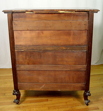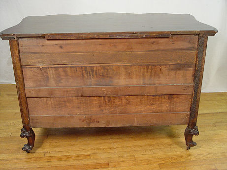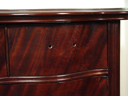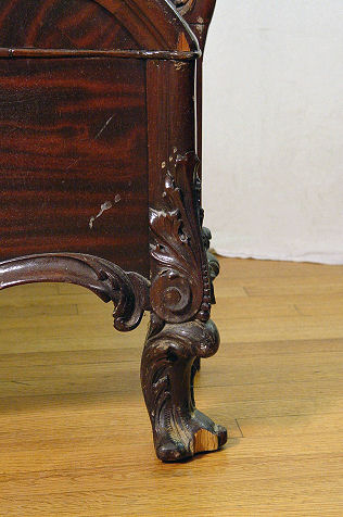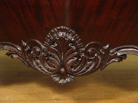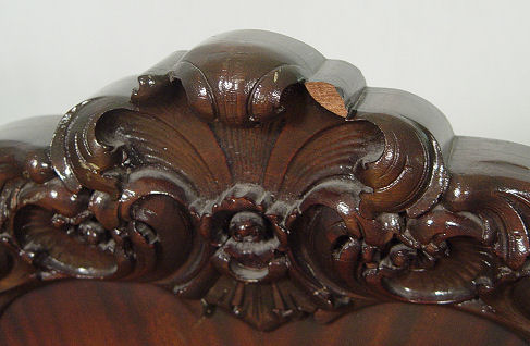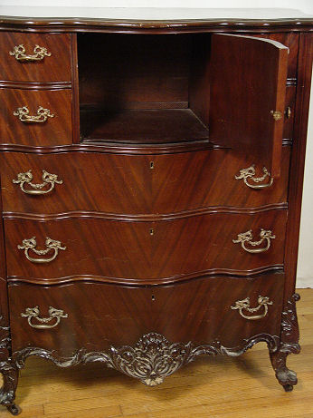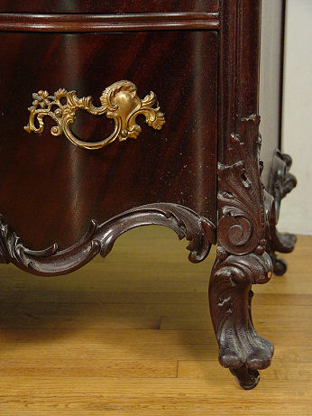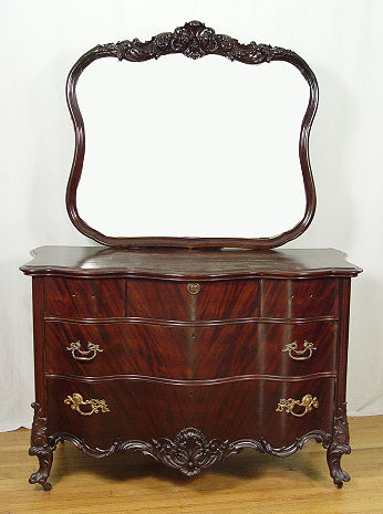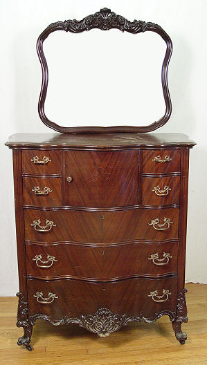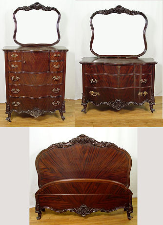 5 PIECE CARVED MAHOGANY BEDROOM SUITE: To include full size bed, tall chest, dresser, and 2 mirrors. All pieces do match and have the same deep, rich carving. The mirrors are free hanging.